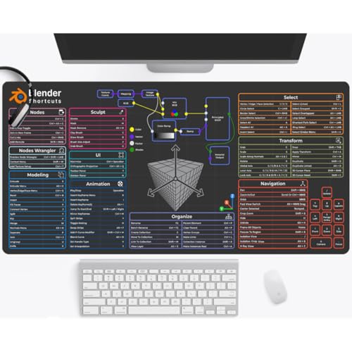 BlenderショートカットデザインのXXLマウスパッド。サイズは35.4×15.7インチで、滑り止めやステッチエッジ付き。ゲームやオフィスに最適なデスクパッドです。