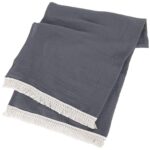 ブルーグレーのガーゼブランケットは、夏用で軽やかな肌触りが特徴。おくるみやひざ掛け、ベッドスローとしても活躍。インテリアにも適したデザインで、ソファカバーや掛け布団としても使えます。
