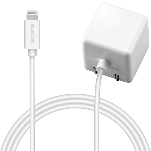 エレコムのUSBコンセント充電器(5W)は、iPhone13シリーズに対応した1.0mのLightningケーブル付きです。カラーはホワイトで、コンパクトなデザインが特徴です。
