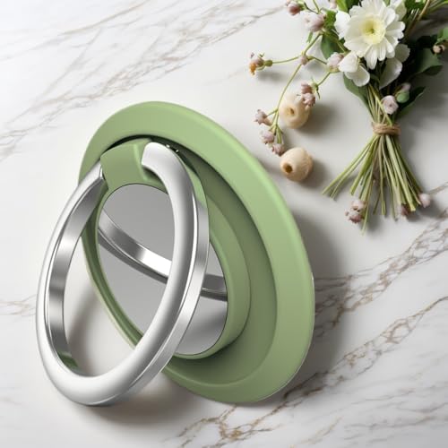 磁気電話リングホルダーは、両面マグネットでフィンガーリングとキックスタンド機能を持ち、iPhone 16 Pro Maxから12まで、ほとんどのスマートフォンに対応するライトグリーンのアクセサリーです。
