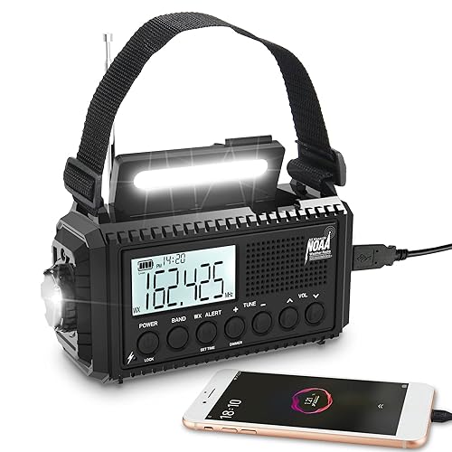 防災ラジオはソーラー・手回し充電機能付きで、FM/AM帯域をカバー。読書灯やSOSアラート、USB充電も可能。IPX3防水設計でアウトドアにも最適。日本語取扱説明書付。
