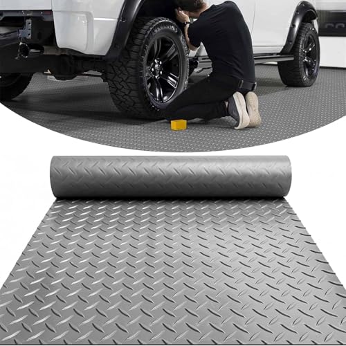 Pounjsd ガレージフロアマットは幅180cm、長さ2m、厚さ1.5mmのゴムシートです。滑り止め、防音、防振機能を備え、水洗い可能。屋外や工場、幼稚園など多用途に対応したグレーのマットです。