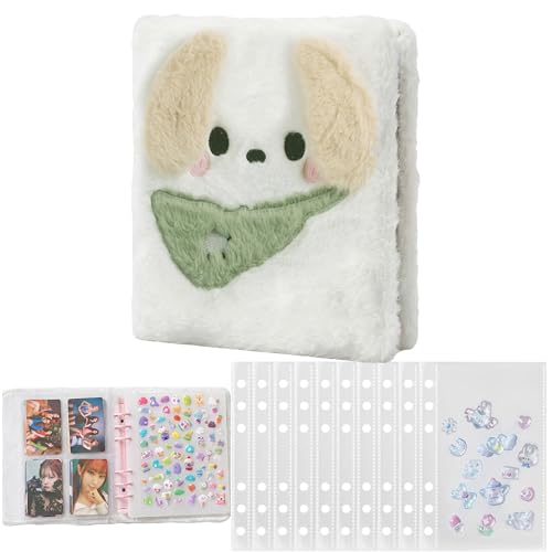 / もこもこ ファー素材 バインダー|カード収納用 活页ファイル|透明リフィル10枚付き|コンパクトサイズ|コレクション整理・持ち運び便利(前掛け風コスチューム子犬デザイン)