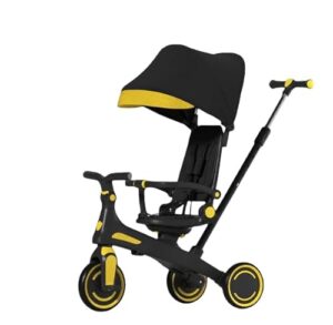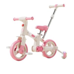 BTMの子供用三輪車は4in1機能で、押し棒や安全バー付き。1歳や2歳の幼児に最適な軽量設計。チョコ×ベージュカラーの可愛いデザインで、おもちゃとしても楽しめる。
