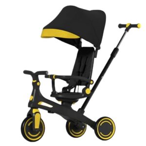 KCNN 子供用三輪車、ベビーカー、5in1折りたたみ式、安全ベルト、日よけ、押し棒、安全バー、シート回転装置、乗用玩具、組み立て簡単 (イエロー)
