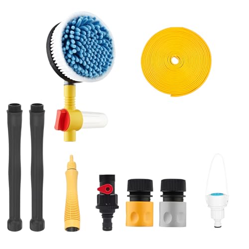 【洗車機セット】と【自動回転ブラシ】、高圧泡スプレーと軽量モップ付きの家庭用洗車機です。簡単な操作で手軽に洗車が完了し、時短お手入れが可能。