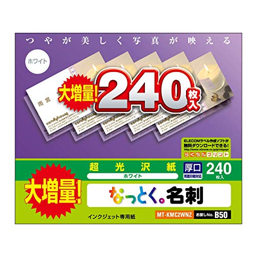 エレコムの名刺用紙マルチカードは、240枚分(1面×240シート)の厚口片面印刷対応インクジェット光沢紙です。日本製で、高品質な名刺作成が可能です。お探しNo.:B50。