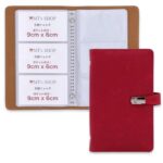 MTの名刺ホルダーはB6サイズで、フェイクレザー製。120枚収納可能で、片面3面ポケット付き。持ち運び便利で、簡単に整理できる開閉ベルト搭載のレッドデザイン。
