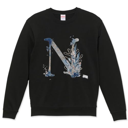 プリントトレーナー メンズ Mサイズ。長袖スウェットで裏起毛仕様。おしゃれなクルーネックデザイン。色はブラック(黒)。商品番号019666。快適な着心地とスタイリッシュなフォントのアルファベット入り。