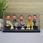 ライオネル・メッシのサッカーフィギュア(5個)、トロフィー(5個)付きのセット。お子様向けのコレクタードールで、インテリアや贈り物に最適。透き通った小箱に入っています。