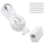 【20個ケーブルホルダー付き】15mホワイトRJ11 6P4C電話機延長ケーブル。直線型・薄型モジュラーケーブルで、インラインカプラー内蔵。長距離通信に対応し、高耐久設計。オフィスや自宅で便利な製品。