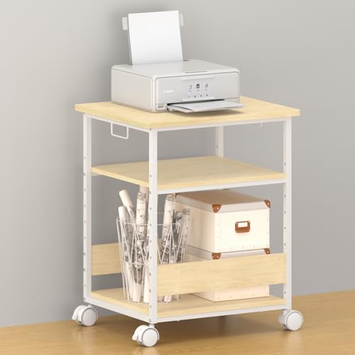 MIYOKI プリンター台は、キャスター付きで幅60cm、奥行50cm、高さ70cm。総耐荷重90kg、A3・A4対応でコピー機も収納可能。中棚は9段階調節でき、組立が簡単なホワイトのデザインです。