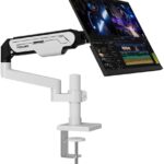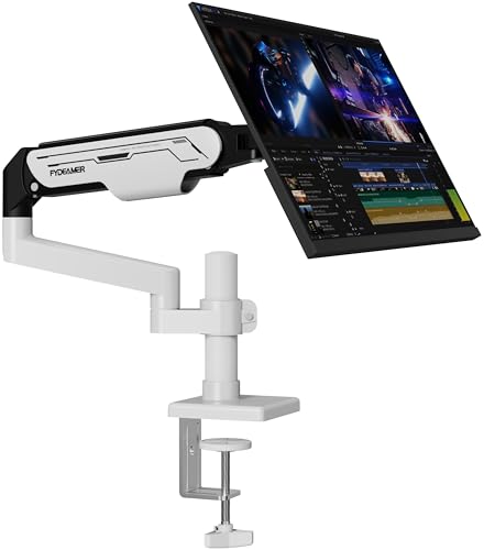 Fydeamer PCモニターアームは17-32インチ対応で、ガススプリング式のフルモーション調整が可能。VESA 75/100に対応し、耐荷重2-9kg。クランプ&グロメット取り付けができ、ケーブル管理機能も搭載。ホワイト&ブラックのデザイン。