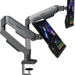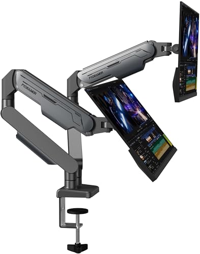 Fydeamerのデュアルモニターアームは、17-32インチの液晶ディスプレイに対応し、湾曲モニターにも適しています。ガススプリング式でフルモーション調整可能、VESA 75/100規格に対応し、各モニターの耐荷重は2-9kgです。ガンメタルグレーのデザインが魅力です。