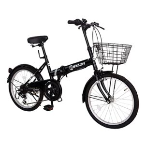 折りたたみ自転車 折り畳み自転車 20インチ シマノ6段変速 カゴ付 ワイヤ錠・ライトのプレゼント付き 前後泥除け装備 ハンドルの高さ調節できる 小径車 ミニベロ ブラック