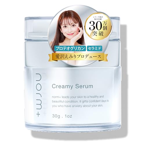 愛沢えみりプロデュースのnorm+クリーミーセラムは、30gの高保湿美容液。スーパービタミンE、ヒト型セラミド、スクワラン配合で、優れた保湿力を持ち、しっとり整肌します。国内製造の安心品質。