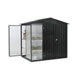 【収納ラック付き】屋外物置 スチール 大型収納庫 防錆 防水 引き戸 ガーデンストレージ オープンラック 屋外収納 ガーデニング 庭 (ブラック, 温室付き)