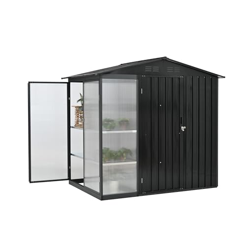 / 【収納ラック付き】屋外物置 スチール 大型収納庫 防錆 防水 引き戸 ガーデンストレージ オープンラック 屋外収納 ガーデニング 庭 (ブラック, 温室付き)