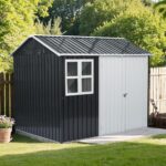 Donextの屋外スチール倉庫は、幅249x奥行き184x高194cmの大型サイズ。防さび・防水仕様で、ガーデニングやベランダ収納に最適。色はグレー+ホワイトのスタイリッシュなデザイン。