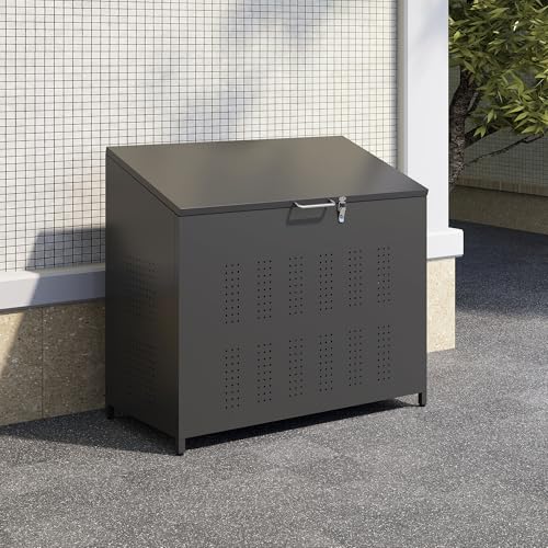 BTMの大型物置は屋外ゴミ箱として最適。容量280Lで、カラスや野良猫から守り、換気口付きで湿気対策もバッチリ。庭用にも便利な収納庫です。