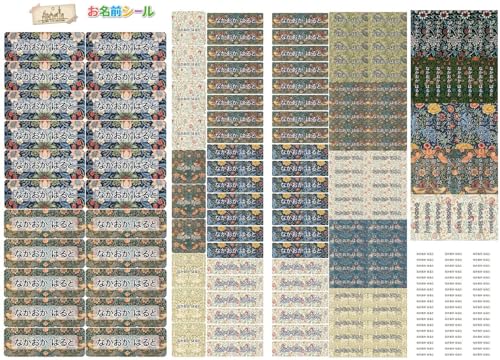 お名前シールはロマンフォントで、ウィリアム・モリスデザインの耐水性があります。入園準備や名入れが可能で、サンプルに最適。食洗機・電子レンジ対応で便利です。