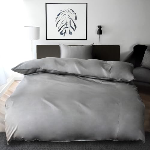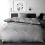 日本製のセミダブル布団カバーセット3点(掛け布団カバー、ボックスシーツ、枕カバー)。350本高密度生地、綿100%でサテン仕上げ。防ダニ・シルクのような肌触り。おしゃれなムーンストーングレー色で北欧ホテル仕様。