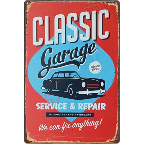 ブリキ看板 ガレージ用のヴィンテージ風インテリア雑貨。サイズは20×30cmで、クラシックカーやカーメンテナンスをテーマにしたデザイン。アメリカンスタイルに最適な壁飾りです。