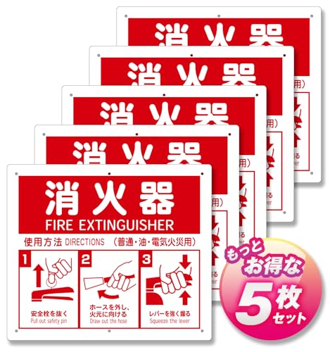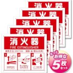 消火器使用法を示す標識プレート5枚入り。サイズは21.5×25cm、厚さ1mm。消火器置場を明示するイラスト付きで、取付穴が6ヶ所(3mm穴)あり。PVC製で耐久性も高い。