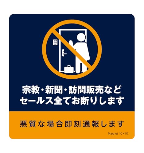 チラシお断りマグネットはネイビー色で、1枚入。正方形デザインで玄関やポストに適し、セールスや勧誘防止に最適。屋外用で防水機能も備え、安心して使用できます。