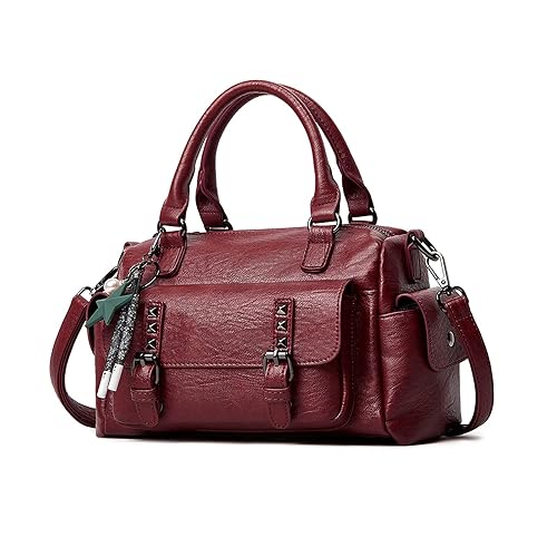 NICOLE&DORIS ミニボストンバッグ レディース 革 ハンドバッグ 2way ショルダー 斜めがけカバン レトロ 肩掛け 手提げかばん 軽量 底鋲付き 可愛いチャーム付き 防水レザー 自立 通勤 デート ladies bag ワインレッド