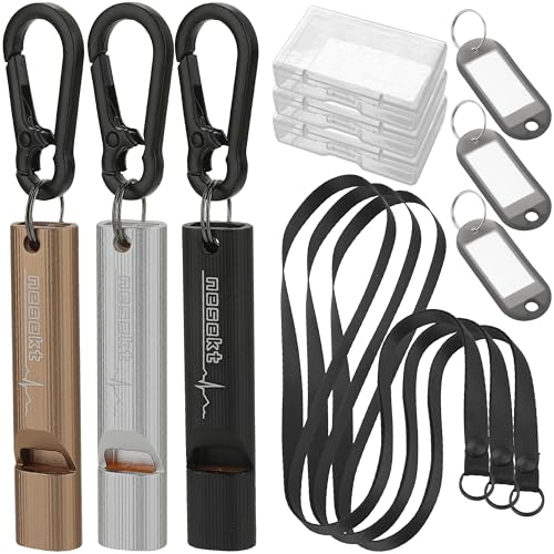 ネセクトのエマージェンシーホイッスル。軽量アルミ製で大音量、防災やアウトドアに最適。ストラップやカラビナ、ネームプレート付き。食品衛生法適合品。マルチカラーBの3個セットです。