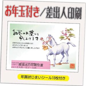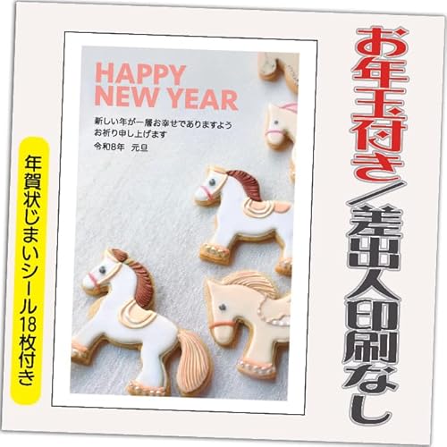 年賀状 2026 お年玉付きで、午年(うま年)デザインのはがきが20枚セット。印刷済みで差出人なし、年賀状じまいシール付。お正月の挨拶に最適です。