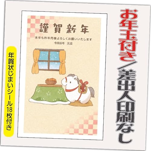 2026年用の年賀状(午年)のセットです。お年玉付きで20枚入り、差出人なしのデザイン(HA098)。年賀状じまいシールも付いており、印刷プリント済みです。