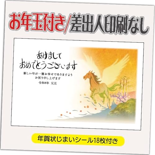 2026年賀状、お年玉付き20枚セットです。色鮮やかなデザインで、特別な年始のメッセージを伝えます。2026年の干支「ウサギ」モチーフもあり、お年玉が当たるチャンスも!