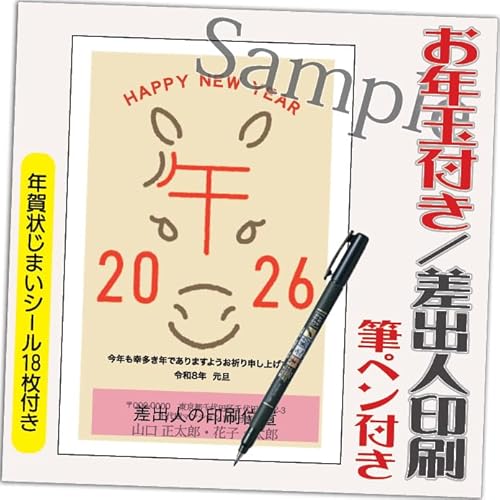 年賀状 2026 お年玉付き年賀はがき【20枚 筆ペン付き】午年 うま年のデザイン(HA077)。20枚に差出人印刷込みで、住所はご注文の「お届け先住所」と「氏名」を印刷。年賀状じまいシール付です。
