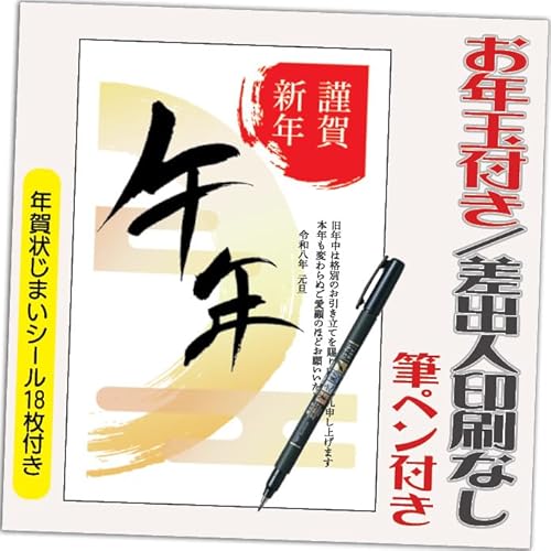 2026年用のお年玉付き年賀はがき(20枚セット)。午年(うま年)デザイン(HA105)。筆ペン付き、印刷済み、差出人なし。年賀状じまいシール付で便利。