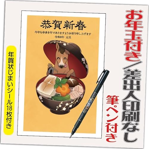 年賀状 2026 お年玉付き 年賀 はがき【20枚 筆ペン付き】午年 うま年 年賀状じまいシール付 印刷 プリント 20枚 差出人なし(デザイン:HA140)の高価買取ITEM