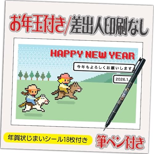年賀状 2026 お年玉付き 年賀はがき(20枚)筆ペン付き。午年デザイン(HA168)。年賀状じまいシール付、印刷済み、差出人なし。特別な新年の挨拶に最適です。