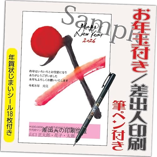 年賀状 2026 お年玉付き 年賀はがき 4枚 筆ペン付 午年用。印刷プランには差出人住所+氏名の印刷が含まれ、年賀状じまいシール付き。デザインはGB04。