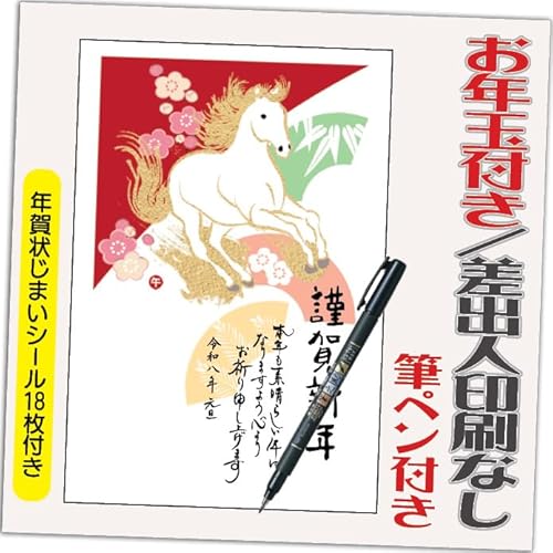 年賀状 2026 お年玉付き 年賀 はがき【4枚 筆ペン付き】午年 うま年 年賀状じまいシール付 印刷 プリント 4枚 差出人なし(デザイン:HA028)の製品情報