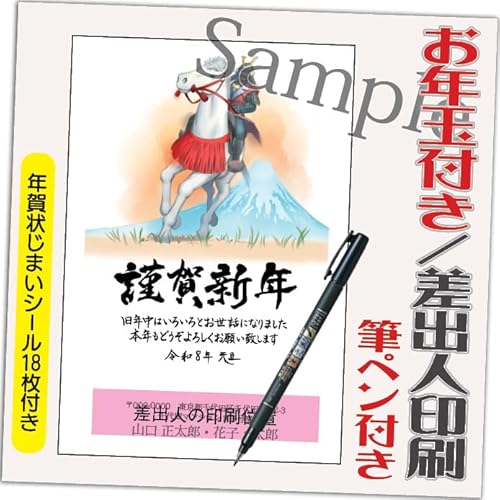 年賀状 2026 お年玉付き 年賀 はがき【4枚 筆ペン付き】午年 うま年 年賀状じまいシール付 印刷 プリント 4枚 差出人印刷込み(デザイン:HA036)印刷する差出人住所はご注文時の「お届け先住所」+「氏名」を印刷いたしますの高価買取