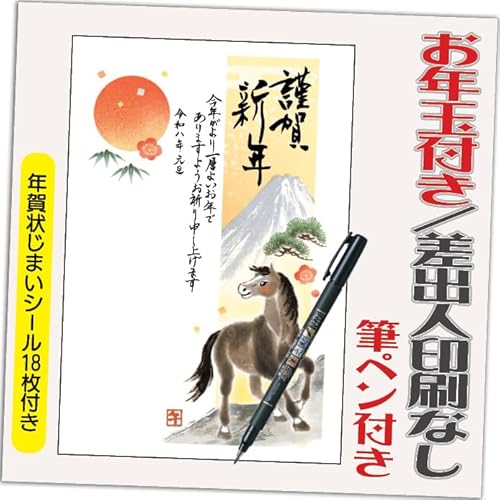 年賀状 2026 お年玉付き 年賀 はがき【4枚 筆ペン付き】午年 うま年 年賀状じまいシール付 印刷 プリント 4枚 差出人なし(デザイン:HA048)の高価買取