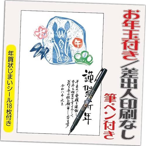 年賀状 2026 お年玉付き 年賀 はがき【4枚 筆ペン付き】午年 うま年 年賀状じまいシール付 印刷 プリント 4枚 差出人なし(デザイン:HA055)の製品情報