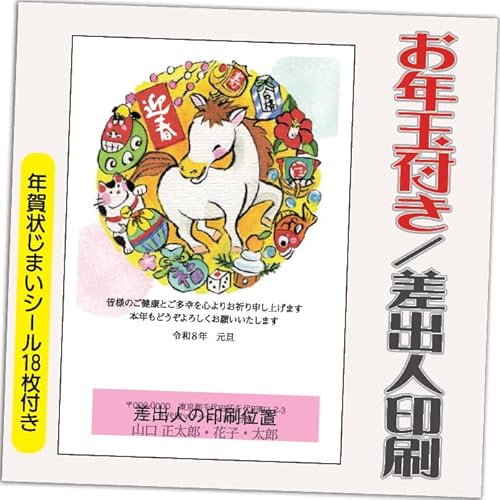 年賀状 2026 お年玉付き 年賀はがき【12枚】午年 うま年。デザインGE11を用いた印刷、10枚に加え2枚の差出人印刷込み。注文時の「お届け先住所」と「氏名」を印刷します。
