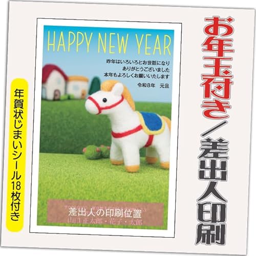 年賀状2026お年玉付き、午年用の12枚セット。印刷済み10枚+2枚、差出人印刷込み(デザイン:GP03)。ご注文時のお届け先住所+氏名が印刷されます。年賀状じまいシール付。