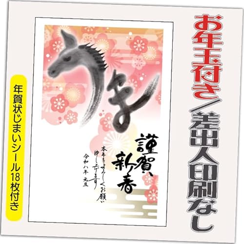 2026年の年賀状、12枚セットの午年デザインです。お年玉付きで、印刷済みの10枚と差出人なしの2枚が含まれています。年賀状じまいシールも付属。新年のご挨拶に最適です。