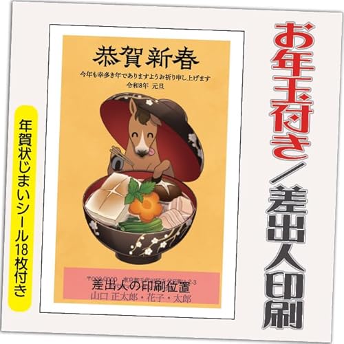 年賀状 2026 お年玉付き 年賀 はがき【12枚】。午年(うま年)デザイン HA140。印刷内容:差出人住所(お届け先住所)と氏名。10枚+2枚の特典、年賀状じまいシール付き。