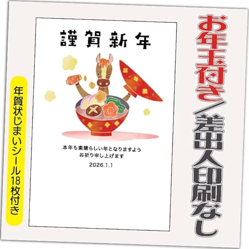 2026年用の年賀状、午年デザイン(HA141)。お年玉付きで、12枚入り(10枚+2枚)。差出人なしで、年賀状じまいシールも付属。印刷済みで手軽に利用できます。