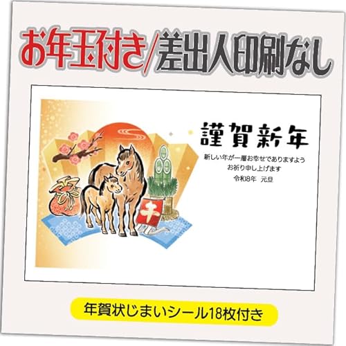 年賀状2026用のお年玉付き年賀はがき12枚セット。午年デザイン(HA158)で、選べる10枚+2枚。差出人なしのプリント仕様。年賀状じまいシール付。