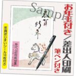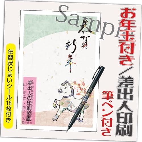 年賀状 2026 お年玉付き、午年デザインの12枚セット。筆ペン付き、印刷済み差出人情報(お届け先住所+氏名)あり。数量10枚+予備2枚、年賀状じまいシールも付属。